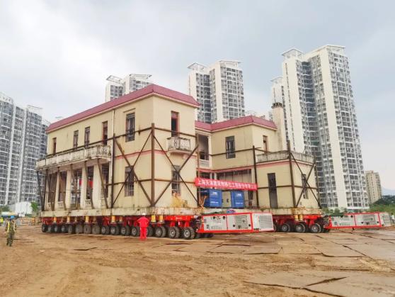 “其中,开挖土方,设置托换梁,顶升建筑就相当于做出一个盘子。”吴良伟介绍,做好这一步后,就可以把建筑装上SPMT自行式液压平板车,平移至新址,再缓缓将建筑交替降落,最后浇筑混凝土将房子与新址地基相结合。