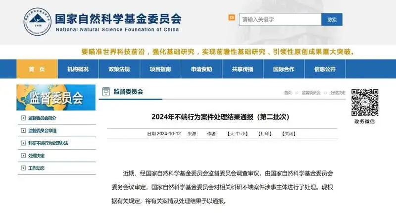 国家自然科学基金委员会通报页面官网截图国家自然科学基金委员会监督委员会决定依据《国家自然科学基金项目科研不端行为调查处理办法》第四十七条、第四十条、第四十二条第五项、第四十六条,撤销黄飞若国家自然科学基金项目“组蛋白乙酰化调控Wnt∕β-catenin通路在猪肝脏氨代谢中的作用及机理研究”(批准号31572409)和“PCAF调控丙酮酸代谢在妊娠后期母猪肝脏糖代谢紊乱中的作用机制”(批准号32072742),追回2个项目的已拨资金,取消黄飞若国家自然科学基金项目申请和参与申请资格5年(2024年3月26日至2029年3月25日),给予黄飞若通报批评。