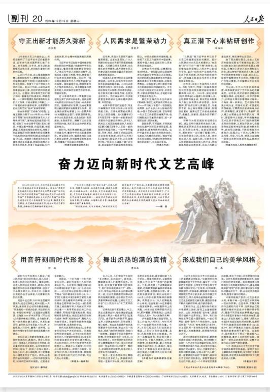 10月15日,《人民日报》第20版以《奋力迈向新时代文艺高峰》为题,刊发了尚长荣、梁晓声、冯远征、舒楠、黄豆豆、杨磊等撰写的文章。以下为全文↓↓↓