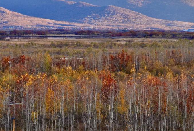 秋风不燥,阳光正好。此时的黑瞎子岛湿地犹如一幅七彩油画,镶嵌在黑龙江和乌苏里江上。枯黄的小叶障、火红的枫叶、金黄的白桦、如雪的芦花点缀在黑瞎子岛湿地如织的河道两侧,共构成了一幅多姿多彩的秋日山水画。候鸟都已南迁,黑瞎子岛上没有夏日百鸟的喧嚣,只有秋风和遍布湿地的小叶障在共同弹奏一曲秋日的私语。