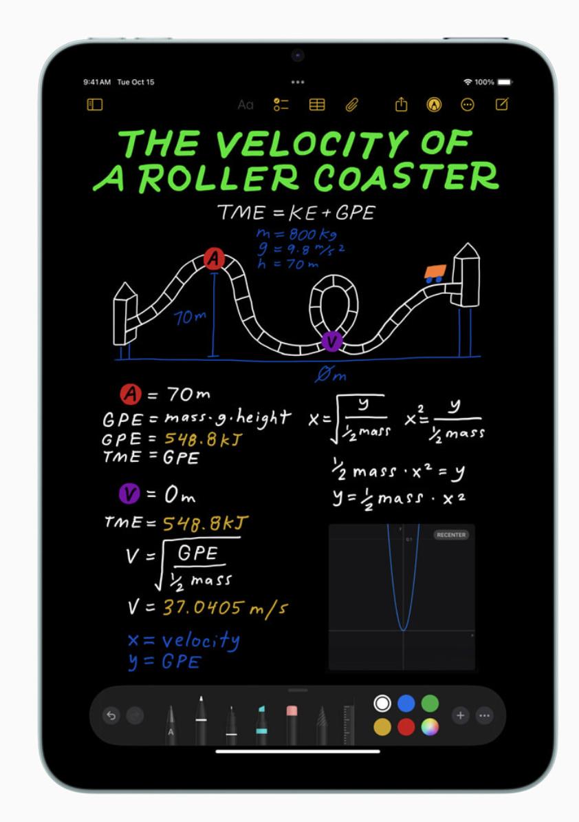 用户还可以搭配Apple Pencil Pro使用iPad mini。Apple Pencil Pro可感应用户的轻捏手势并弹出工具面板,以供快速切换工具、线条粗细及颜色。自定触觉引擎可通过轻微反馈确认用户的轻捏、轻点两下或吸附到智能形状。