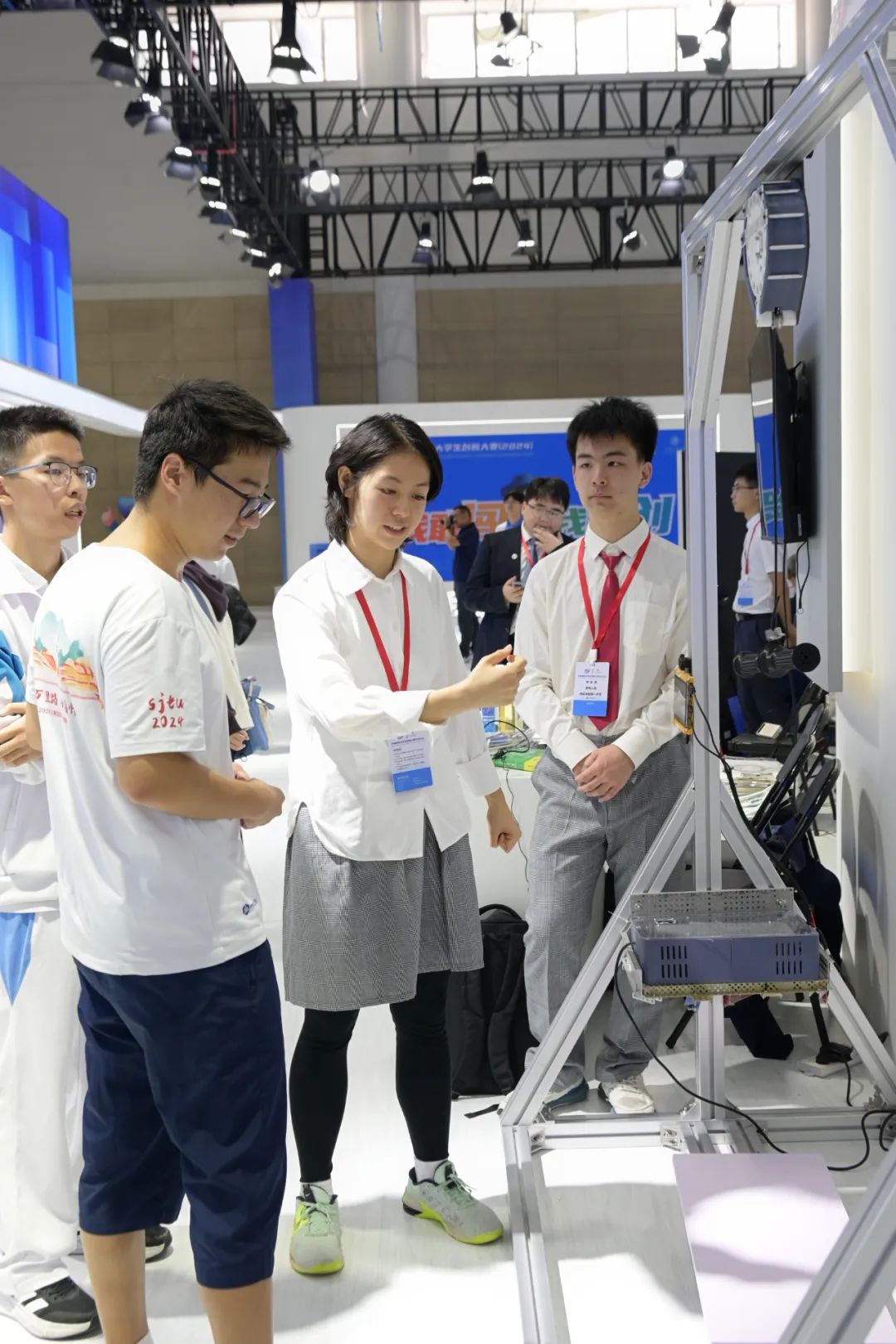 在大学生创新成果展上,参赛选手介绍团队项目顶天——在科技最前沿展现青春作为