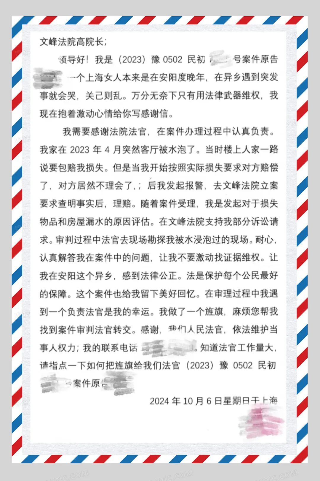 金风送爽,秋意渐浓,又到了一年丰收的季节,而在这个时节里,一封感谢信和一面锦旗跨越了千山万水,从千里之外的上海寄到了文峰区法院,信中,当事人徐女士用真挚的字句讲述了民事审判庭法官杨金书在案件办理过程中的耐心细致、认真负责,同时表达了她对法官的感激之情。