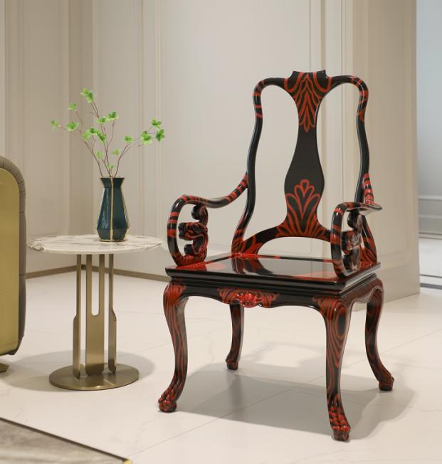 辰龙椅该作品运用了海派家具制作技艺。每一个细节都经过精心设计和制作,确保了椅子的完美呈现。黑底红色抽象纹理的漆面处理,展现了漆画的精湛技艺,与龙的神秘气质相契合。