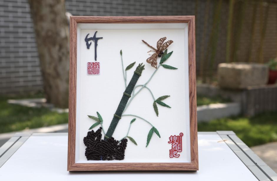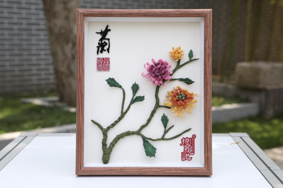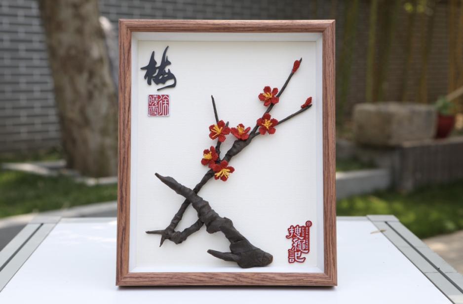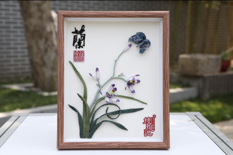 梅兰竹菊梅兰竹菊系列摆台,一组四件,运用了非遗绳编技艺。以0.8毫米蜡线为材料,采用斜卷结编织技法立体编织,多层叠加组合,呈现了花中四君子,色彩清韵雅致。