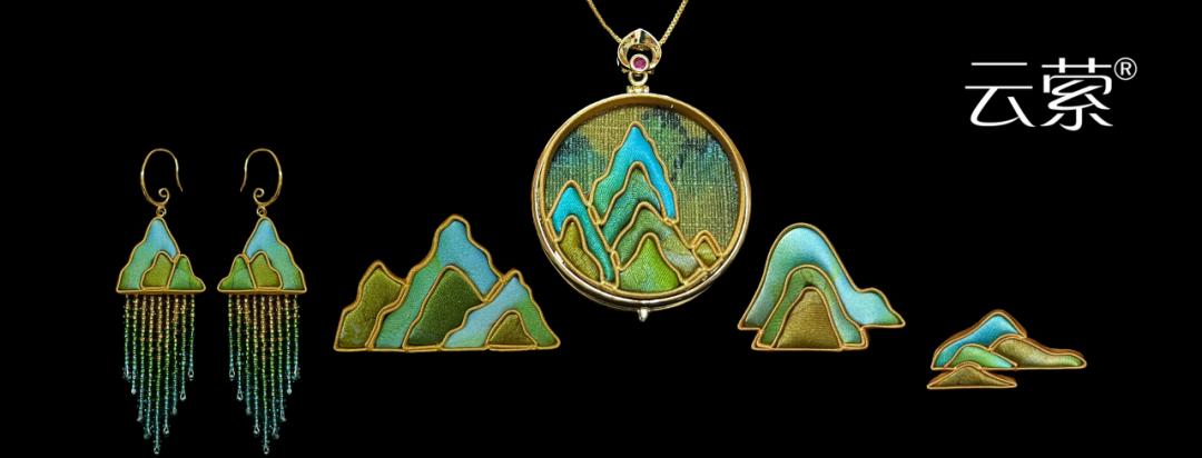 “千里江山”盘扣饰品系列“千里江山”盘扣饰品系列,以中式服装盘扣制作技艺为表现手法,在手工盘制山峦造型的基础上,使用了创新的“俏色塞芯”技法,高度还原了青绿山水国画中色彩鲜艳、明亮的视觉效果。同时作品结合了金银花丝技艺、串珠技艺和传统香道文化,充分展现了传统盘扣技艺的创造力、包容性和可塑性。