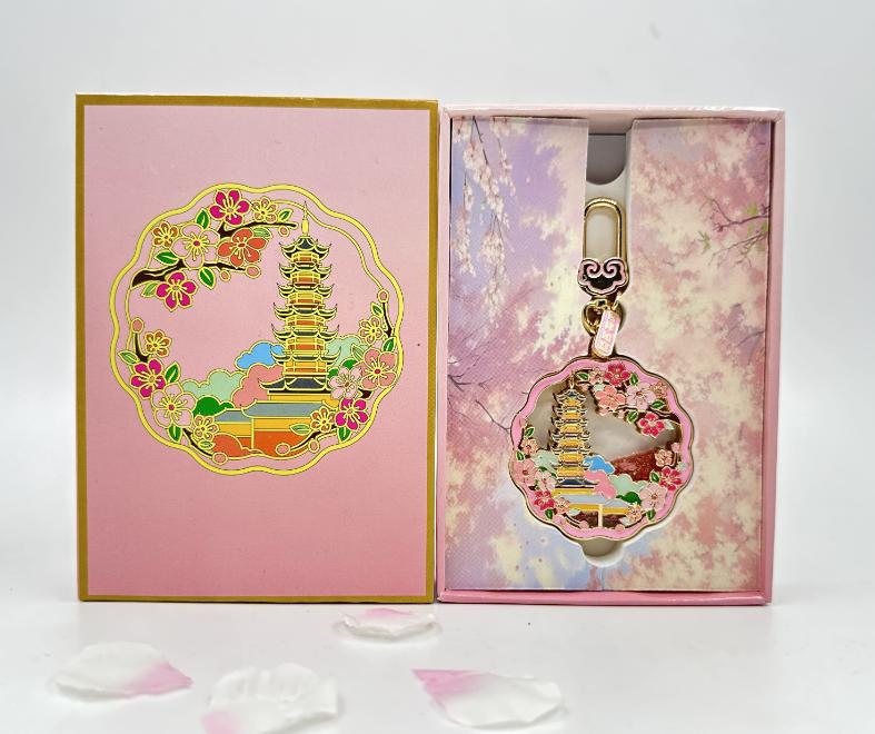 “桃福满园”锌合金钥匙扣本作品运用了珐琅器制作技艺。以珐琅掐丝手绘技法结合珐琅釉料烧制工艺呈现出绚丽多彩的精美珐琅挂件。运用珐琅釉料丰富的颜色层层叠加,结合锌合金的金属材质形成非常富有层次感的珐琅礼品挂件。
