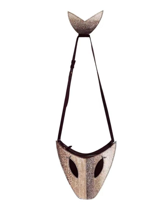 鱼,鱼,鱼本作品运用了赫哲族鱼皮制作技艺。皮包使用经典的大马哈鱼皮为制作材料,利用人体肩膀的结构以及宽窄,使用户的身体与包自然地勾勒出一条线性的“鱼”。皮包两面采用负形设计,能根据用户需要自由变换风格。