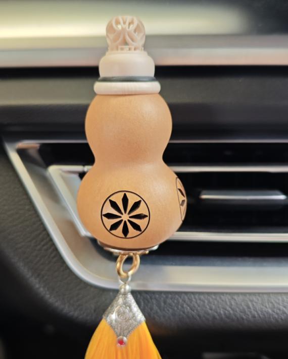 葫芦车载香薰本作品运用了套板葫芦制作技艺。作品以天然葫芦作为主要材料,运用镂空雕刻的技艺在葫芦表面进行雕刻,展现出各种精美的图案,如花卉、云朵、吉祥纹饰等,通过工匠的精湛技艺,使图案栩栩如生,增加了艺术感和观赏性。