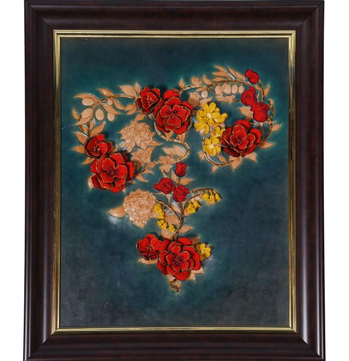 绽放绒花情作品运用上海绒绣技艺制作了7朵立体红色月季和6朵平面玫瑰花苞;运用海派绒线编结技艺钩编了波斯菊和铃兰;运用皮雕技艺雕刻了绣球、月桂、桂花和橄榄及枝干,使所有花叶连接在一起,组成了一个错落有致的“羊”字,繁花似锦、吉祥如意的气息扑面而来。