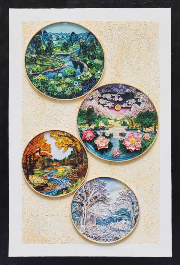 物语该作品以四个圆形的框架为背景,每个框架内都描绘了一个独特的自然景观。 这些画面共同构成了一个四季变换的自然景观,通过不同的颜色和图案来表现每个季节的特点。并通过衍纸艺术的形式,使得画面更加立体和生动。整个作品通过独特的构图、精湛的技艺和丰富的文化元素,展现了中国传统文化的魅力和风采。