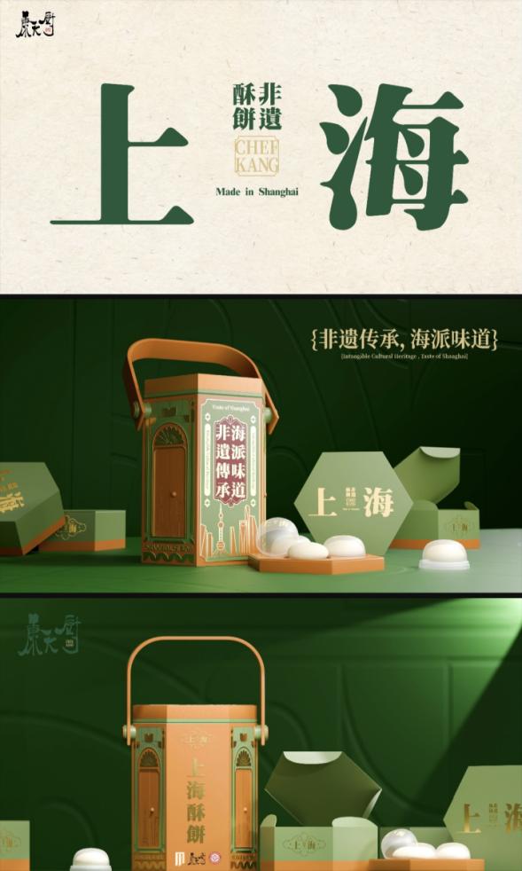 上海酥饼——海派石库门礼盒非遗传承,海派味道,以上海酥饼制作技艺为基础,并在锁鲜工艺研发和隔夜加热技术上有所突破创新。 6大口味,品上海。玉兰,栗子,拿铁酥饼品味摩登上海味,黑洋沙,肉松,苔条酥饼品味百年上海传统味。礼盒的设计采用六边形柱体作为盒身,并以极具上海建筑特征的石库门作为四面盒身的装饰面,勾勒以金色流线纹样,将Art Deco的艺术表达和建筑人文特点充分融合设计,整体设计不大肆堆砌“上海”,却处处是“上海”。