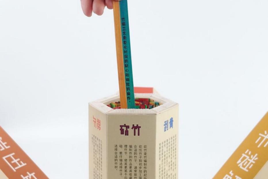 剖竹寻源“剖竹寻源”这款互动体验纸媒深入融合了非遗技艺竹编的核心元素,巧妙再现了竹篾制作的全过程。通过模拟竹篾制作过程,作品将传统竹编工艺的多个关键步骤——从“刮青”、“破竹”到“分条”与“分层”——以直观的方式展现给读者。通过可打开的竹条盒和编织游戏卡,读者还能够了解竹编的历史背景,并亲自动手体验编织技巧。