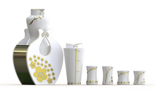 海韵雅樽结合海派旗袍、海派剪纸与中式服装盘扣元素而设计的一套酒具。让人们在品味美酒的同时,感受到上海深厚的文化底蕴与中国优秀传统文化的魅力。