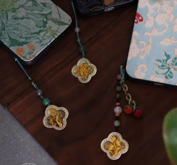 “梅兰竹菊”新中式手机坠此款产品采用金银细工技艺和绳编技艺,最细处可达0.25毫米,采用中国传统基础结之金刚结编法。