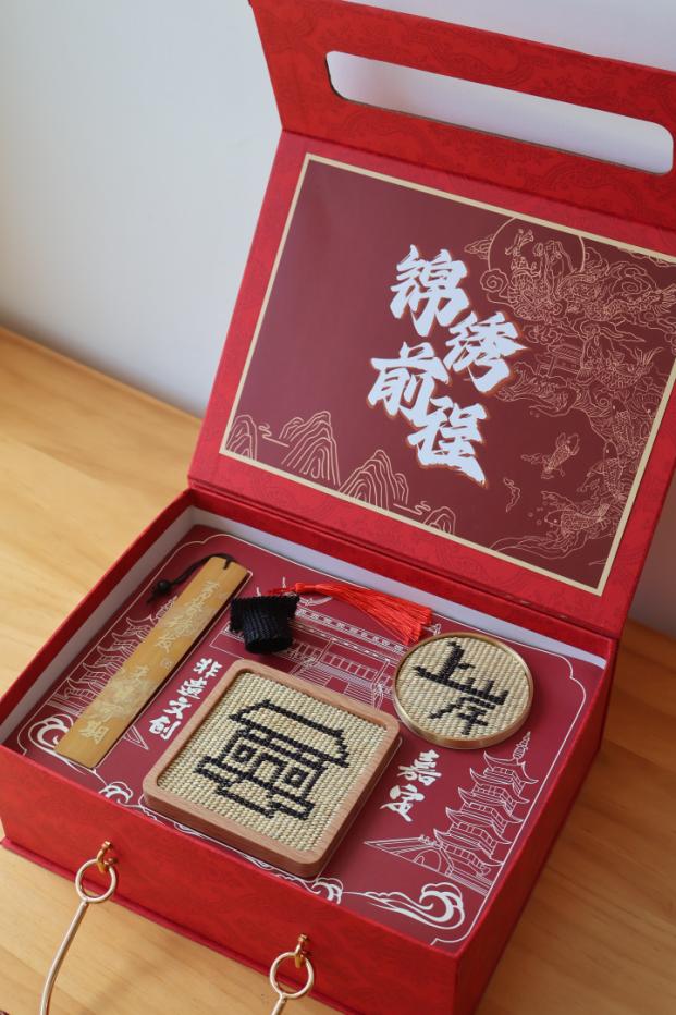 未来可期文创礼盒未来可期嘉定非遗文创礼盒,灵感源自嘉定孔庙的深厚文化底蕴,融合徐行草编与嘉定竹刻两项国家级非遗技艺。礼盒内含草编孔庙杯垫、上岸杯垫及博士帽,寓意祈福求学、功成名就;配以“蓄势待发 未来可期”竹刻书签,传递美好祝愿。