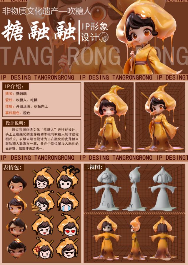 非遗吹糖人IP形象及产品设计对非遗吹糖人进行IP形象及产品设计,年轻可爱的形象更符合当代年轻人的喜好,也更容易进行传播和售卖。