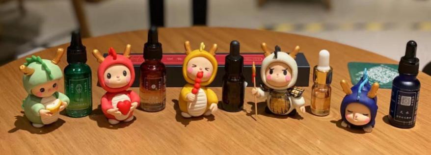 五福龙宝本作品由面塑和中医药香品调制技艺两大非遗相结合。面塑原料中加入了中医配方香粉和泥,又再选用五种颐养身心的汉方精油香品,可滴在面塑玩偶头身,以玩偶作为一个发香载体。为面塑玩偶龙宝宝设计了五个应用场景,既可摆设又可强身健体,产品兼具有观赏性及功效性。
