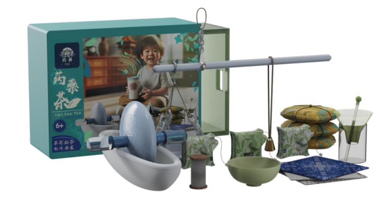 将布依族的中医药和贵州黔南地区的非遗毛尖茶制茶技艺结合形成了新的可食用物品“茶药”,并将其融入食玩中,让孩子们在玩耍玩具的过程中了解到制作中医药的步骤和制作茶包的步骤,并认识到中医文化和茶文化的魅力,同时也让玩具不仅只仅限于玩耍,还具有实用性和食用性。