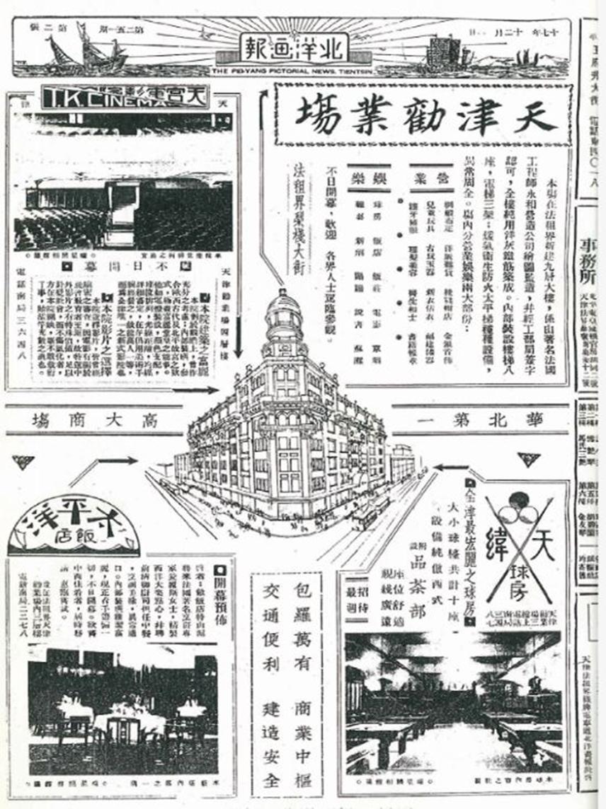 在劝业场开业之前,1928年11月1日的《北洋画报》发布“探店”报道:“一、二楼为洋货绸缎鞋帽食物等店,同类商店不得超过4家,唯三楼之珠宝古玩商店多多益善。三楼还有西餐馆、山东饭庄、茶点店及球房。四、五、六楼主要是剧场、影院、茶社等游艺场所,即所谓‘八大天’……”可见劝业场已经有独立的运营规划,《北洋画报》评论称“调剂商务,用心良苦也”。