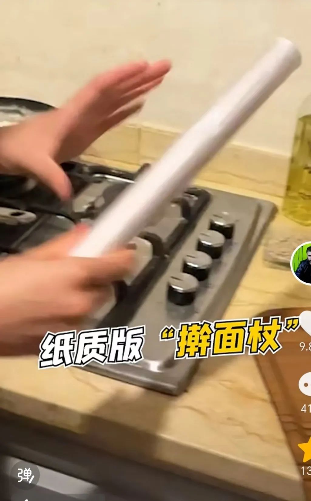 没有擀面杖,就用保鲜膜卷筒来凑合。