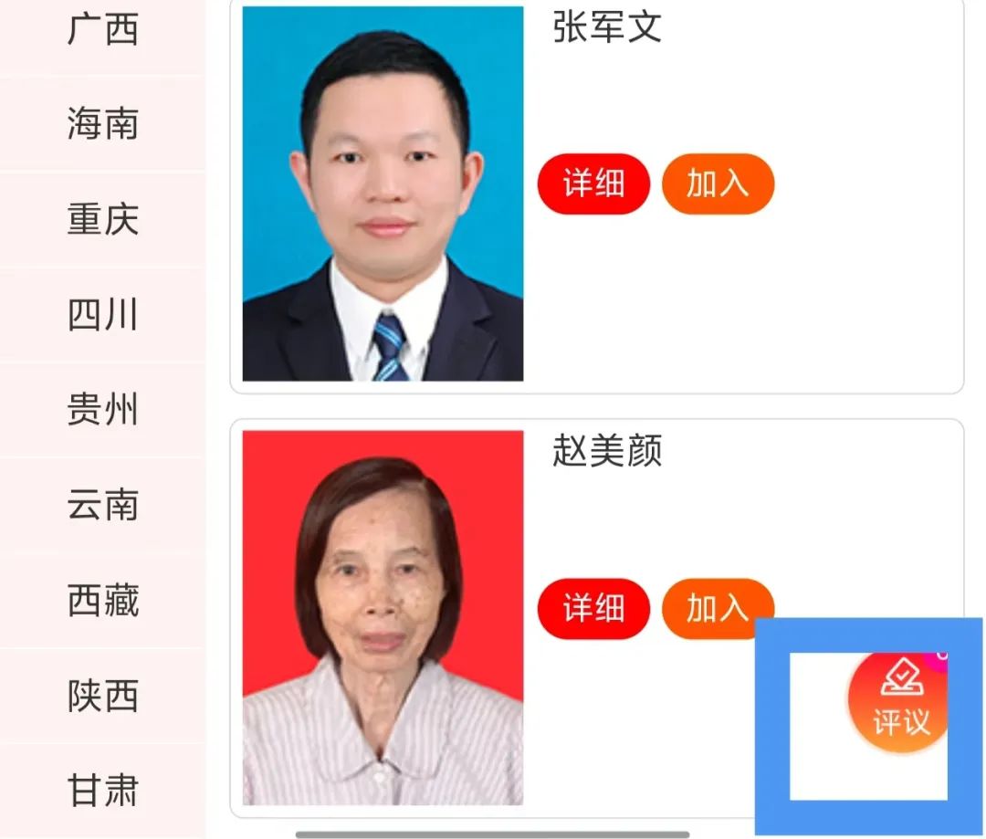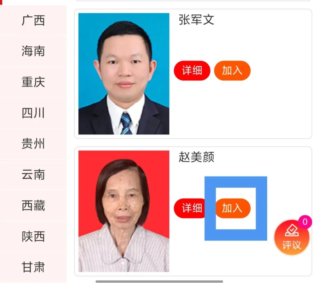 2.找到赵美颜候选人,点击“加入”后,点击右下方“评议”图标③
