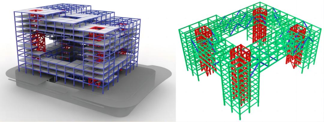 结构设计利用四个角部连续并可落地的竖向交通核作为主要竖向构件,利用7~8层间连接核心筒的大跨钢桁架作为强连接体,使主体结构形成了四个核心筒+四个大跨空间钢桁架的类巨型框架结构体系。