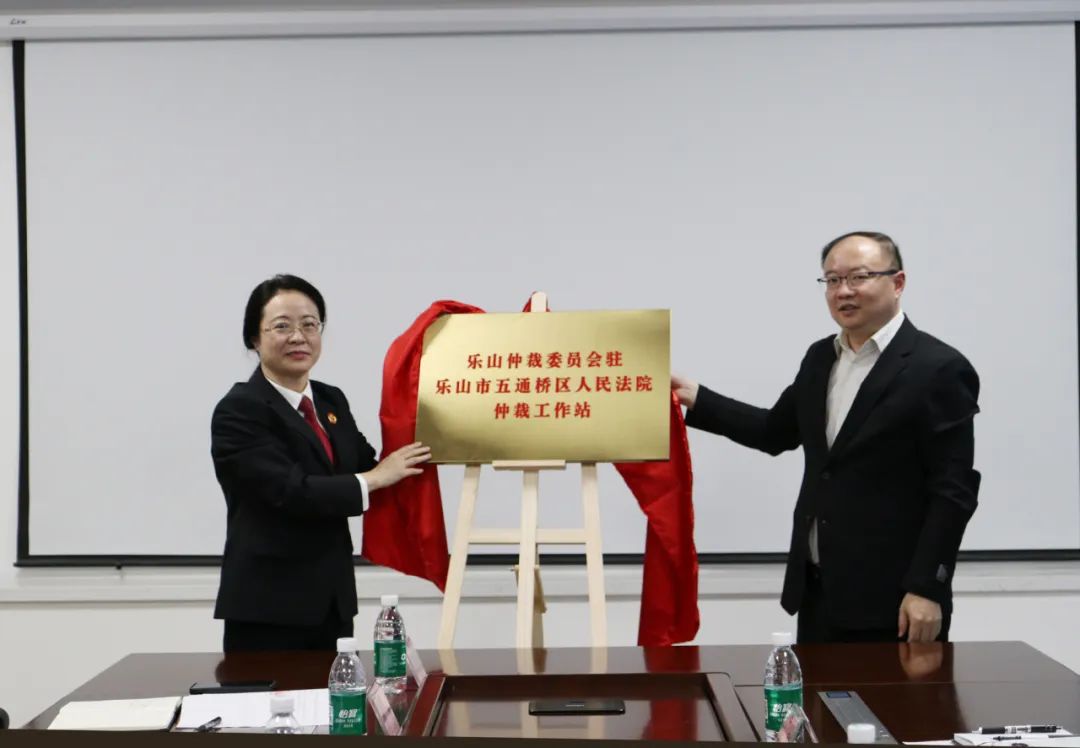 签约仪式上,双方瞄定“将非诉讼纠纷解决机制挺在前面”的共同目标,共商诉裁衔接新机制,共话诉裁对接新前景,共谱法治营商环境新篇章。五通桥区法院党组副书记、常务副院长黄滔和乐山仲裁委员会综合办主任陈黎签署《实施意见》。随后,五通桥区法院党组书记、院长吴蔚,乐山市司法局党委委员、副局长李琦共同为“乐山仲裁委员会驻乐山市五通桥区人民法院仲裁工作站”进行揭牌。