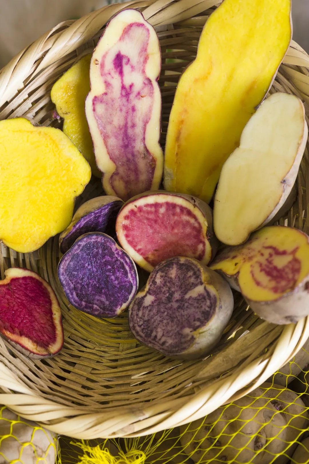 但你有没有见过这些土豆,它们或身披蓝色、黄色或红色的外皮,或布满条纹、波点或眼镜形的图案,有的切开一看内里有着紫色的果肉,还有的果实外观是锥形、糖葫芦形甚至六角风琴形,形状不一。