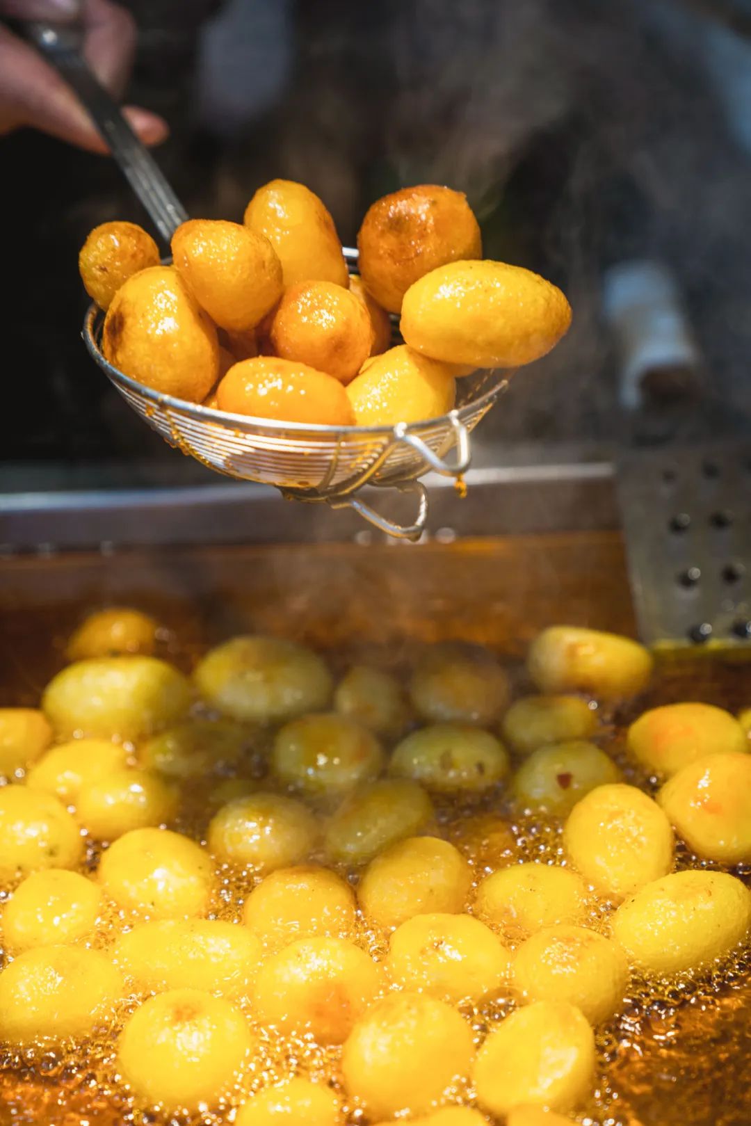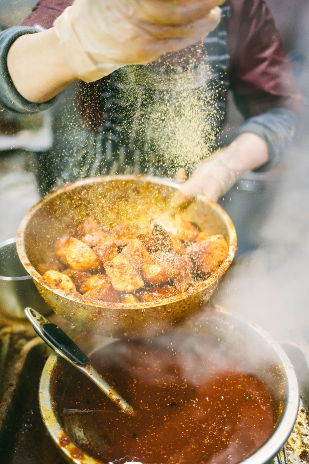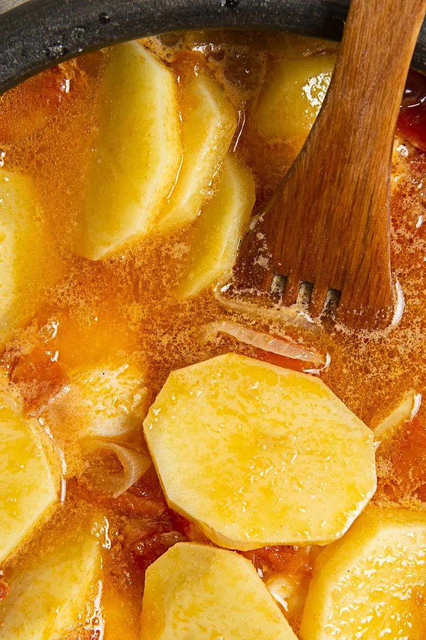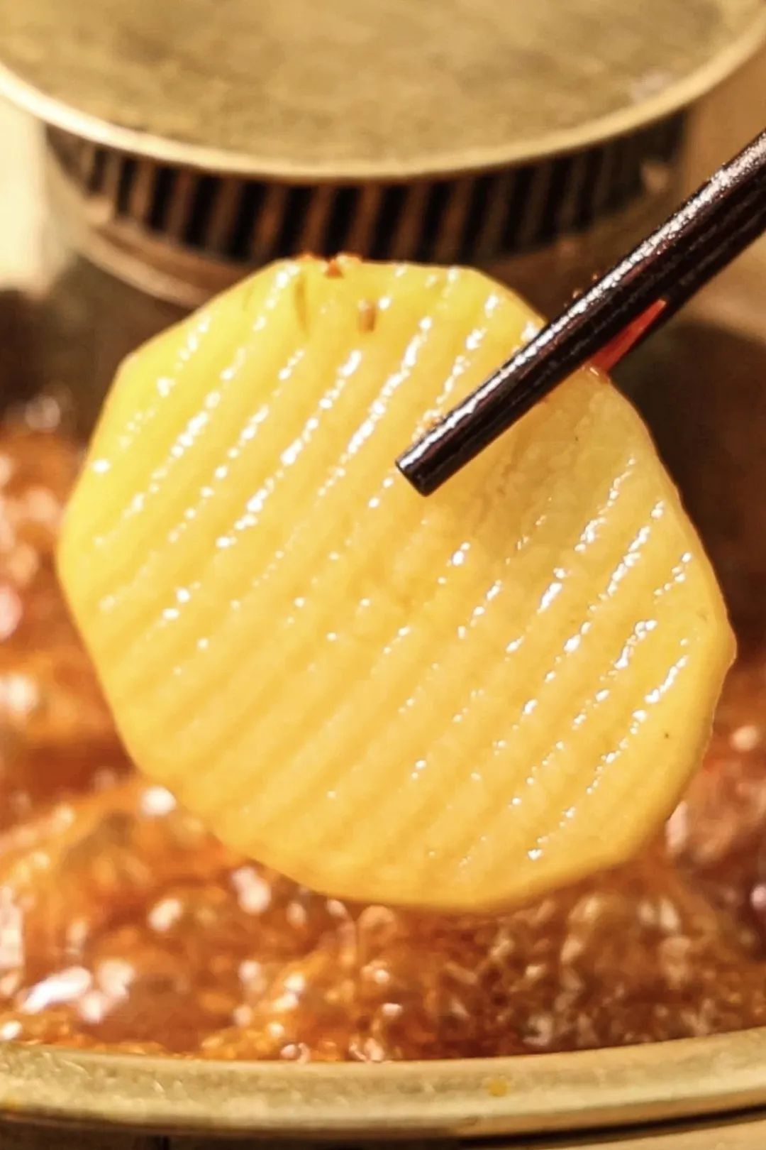 在火锅里,经过在红油汤底里沸腾、翻滚之后,土豆片被火锅汤煮得绵密软实,吸收、浸润了香料和汤底的滋味,最后化在了口腔里,留下了绵长的美妙滋味。