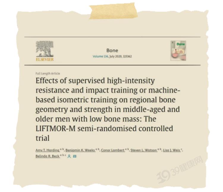 [3]Amy T Harding et al.,Effects of supervised high-intensity resistance and impact training or machine-based isometric training on regional bone geometry and strength in middle-aged and older men with low bone mass: The LIFTMOR-M semi-randomised controlled trial, Bone. 2020 Jul:136:115362. doi: 10.1016/j.bone.2020.115362.