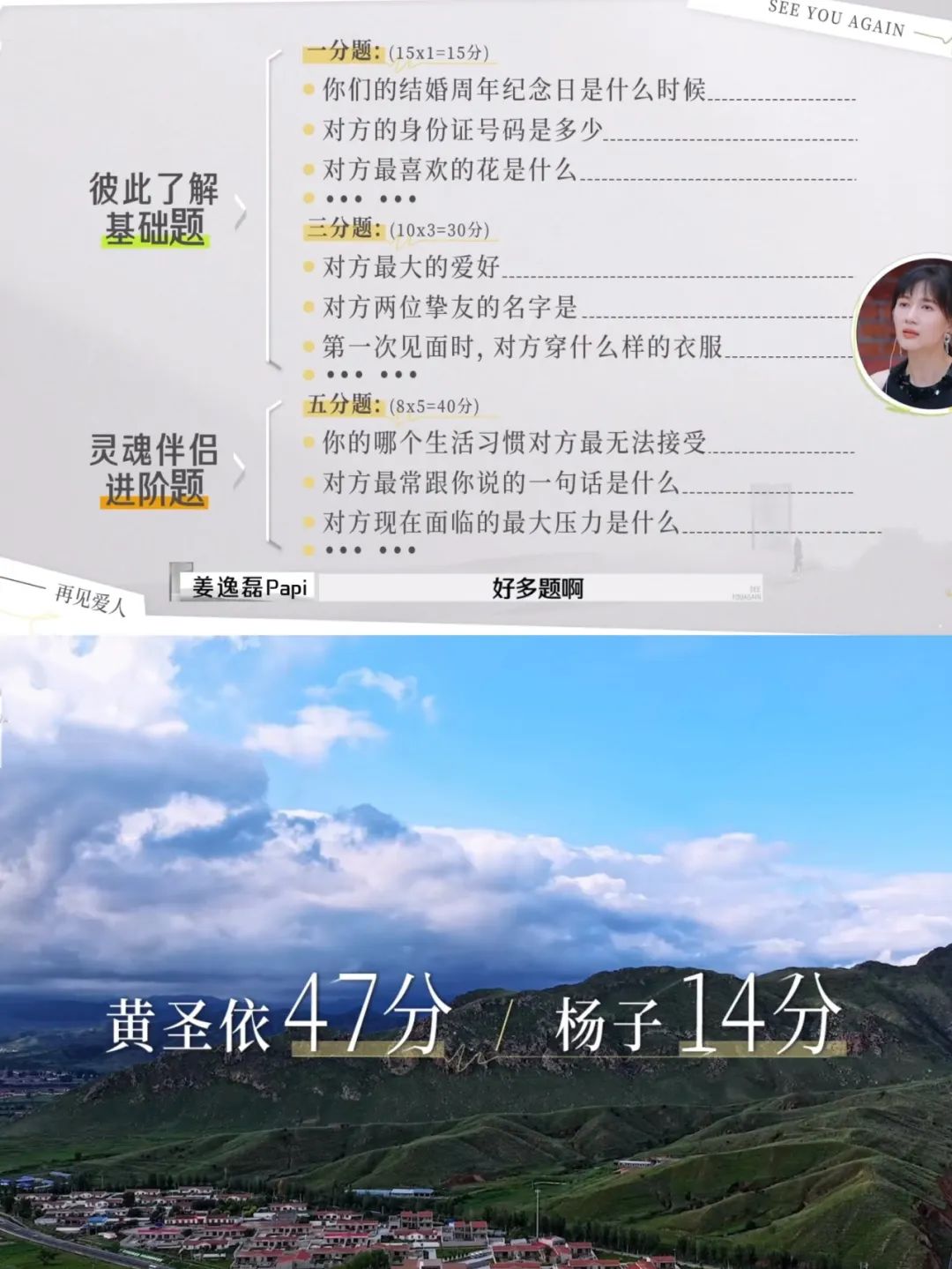 当然,黄圣依总分是47分,也没及格。她说,“我们的关系,工作伙伴肯定多过于夫妻。”