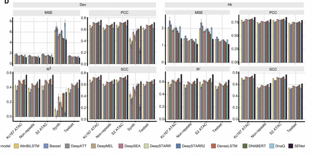 DNA顺式调控元件的可控活性设计平台通过基于Squeeze-and-Excitation注意力机制的深度学习技术(SENet),DREAM自动学习和识别与调控活性相关的DNA“词汇”,并基于这些知识精确预测增强子的活性。研究表明,与现有的其他基于序列预测功能的模型相比(包括Nature论文中首次增强子设计用到的DeepSTARR算法),DREAM的增强子活性预测模块在准确性和性能上有显著提升。