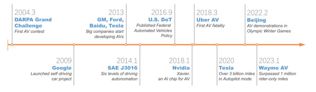 图 1 本世纪自主驾驶的里程碑事件。本文首先回顾了本世纪的自主驾驶领域里程碑事件(图1)。研究发现,尽管自主驾驶技术在封闭测试环境中取得了显著成功,但在实际交通场景中仍然面临严重安全隐患。相比人类驾驶员能够理解他人驾驶意图并与之合理交互,AV则难以理解并融入人类驾驶环境。为了突破这一研究瓶颈,国内外学者在驾驶意图理解方面展开了深入研究。本文将相关研究依据不同学科视角划分为四个关键词集群(图2),并总结了各领域关于驾驶意图理解的方法: