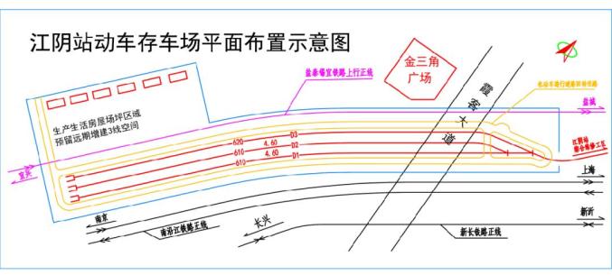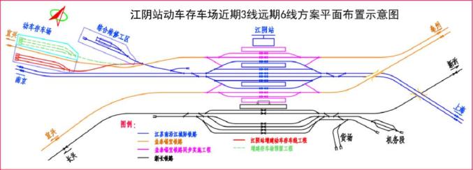 根据批复文件,江阴站增建动车存车场工程线路起自既有江阴站综合维修工区走行线引出,新建动车走行线、3线存车场及相关工程。3条存车线有效长均可满足2列8辆编组动车组存放条件,建设工期为18个月。预测近期2035年办理始发终到动车组列车10对/日,远期2045年办理列车20对/日。