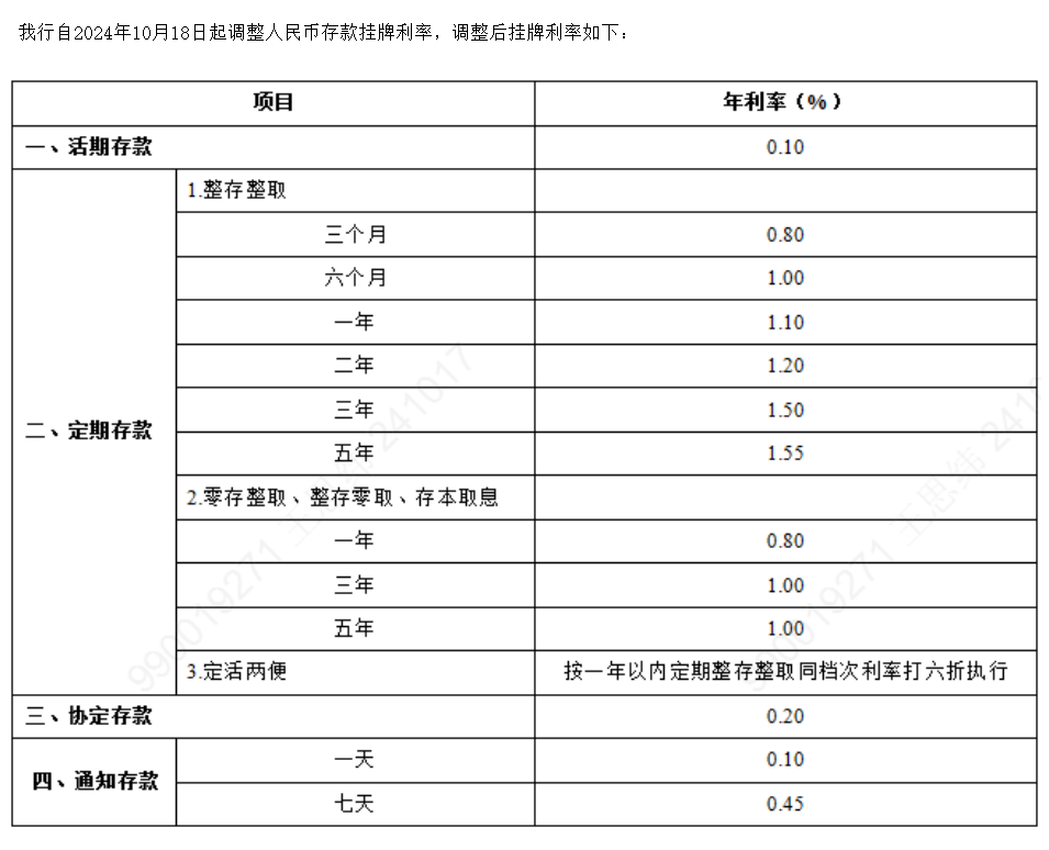 对于零存整取、整存零取、存本取息的定期存款利率均下调0.25个百分点,调整后一年期、三年期和五年期的存款挂牌利率分别为0.80%、1.00%和1.00%。