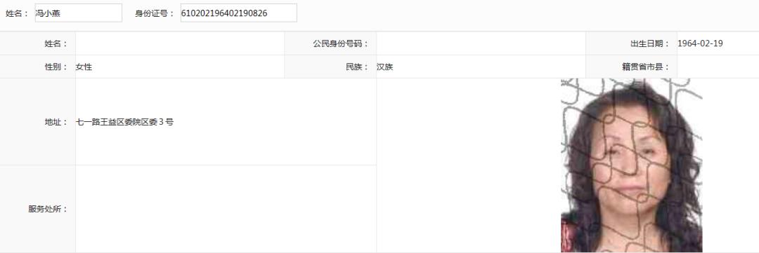 被执行人:冯小燕,女,1964年2月19日出生,汉族,住陕西省铜川市王益区委院区委3号。
