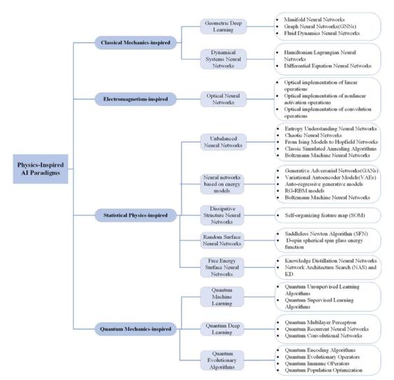 AI meets physics: a comprehensive survey 这篇综述整理了物理学中四大领域(经典力学、电磁学、统计物理、量子力学)的思想如何指导AI模型的构建。文章系统地综述了400多个物理科学思想和物理启发的深度学习AI算法,其框架梗概如图1所示。