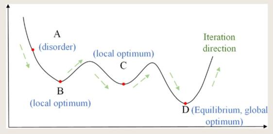 物理退火过程:首先物体处于非晶态,然后将固体加热到足够高的水平使其无序化,然后缓慢冷却,退火到晶体(平衡态)。