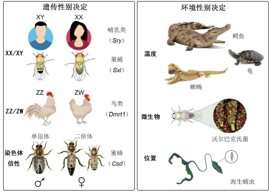 性别决定机制在不同的物种中有很大差异,但可以大致概括为两种:遗传性别决定与环境性别决定(图1)。