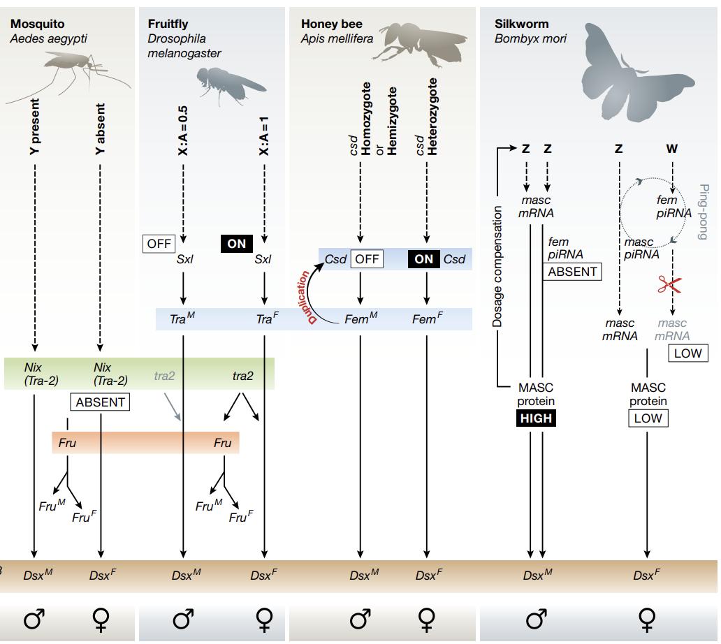 尽管在各物种中性别决定的起始因子存在较大的多样性,但在性别分化的“执行”上,却高度保守的选择了dsx/Dmrt基因。换句话说,性别分化的底层基因高度保守,而上游调控因子在进化上是多变的。也许你还会疑惑——为什么昆虫中进化出针对dsx/Dmrt基因的性别特异性剪接机制,而其他动物中则通过调控Dmrt基因的表达水平来调控性别分化?这是一个非常有趣但还需要未来深入研究的问题。
