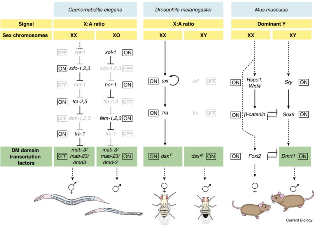 图2. 上游多变但下游保守的昆虫性别决定通路[7]在线虫中,dsx的同源基因male abnormal-3(mab-3)也调控性别分化[8];在小鼠中,Sry和Dmrt1基因在雄性中的表达能够促使性腺发育为睾丸,雌性小鼠中Sry和Dmrt1基因都不表达,性腺发育为卵巢[2]。