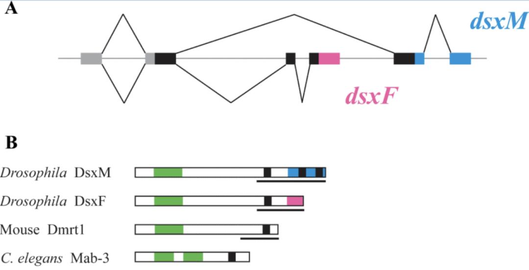 首先,dsx/Dmrt基因调控两性分化可通过两种方式实现:性别特异的转录本,或性别一致的转录本但表达量不同。以果蝇为代表的昆虫性别决定通路,其中一个重要特征就是dsx基因通过性别特异的蛋白产物调控两性分化(图4A):在雄性中表达DsxM蛋白,而在雌性中表达DsxF蛋白。DsxM 和 DsxF 均为转录因子,具有共同的 DM 结构域(高度保守的DNA结合序列, 图4B绿色),因此可能与相同的靶基因结合;而它们通过其性别特异性的 C末端来相反地调节靶基因的表达,进而调控两性分化。与昆虫中利用性别特异的Dsx蛋白调控两性分化不一样的是,哺乳动物与线虫的Dmrt基因的调控都是通过在单一性别中(雄性)表达而实现的(图4B)。