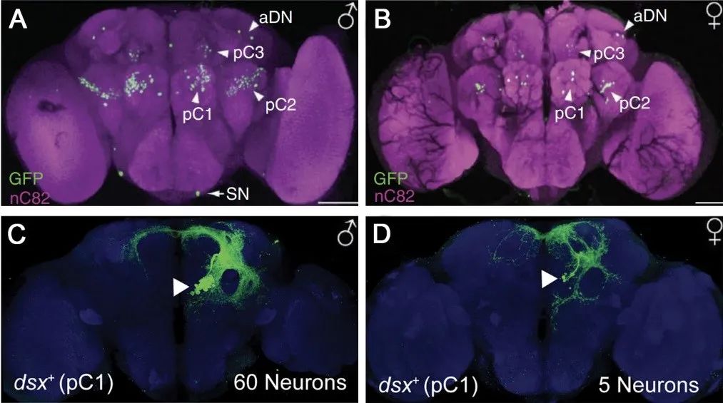 图4. 性别决定基因dsx/Dmrt的结构保守性[10]其次,行为的两性差异往往通过神经系统结构和功能的两性差异来实现。在果蝇中,dsx直接调控神经元发育,进而产生数量具有显著差异的dsx神经元。比如,在雄蝇脑中有约300个dsxM神经元(图5A),而雌蝇脑中只有约60个dsxF神经元(图5B)。