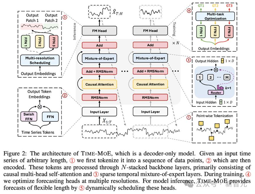 Time-MoE基于decoder-only Transformer,并结合了大规模语言模型中的最新技术。Transformer模块里, RMSNorm对每个子层输入进行了归一化处理,从而提升了训练的稳定性。