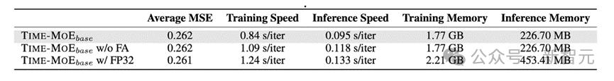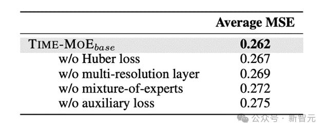 文中进一步提供了一系列消融实验来验证模型框架设计的合理性。实验表明,Time-MoE的设计在提升模型精度上是有效的。特别地,在不使用混合专家的情况下,模型的MSE会有明显的退化。