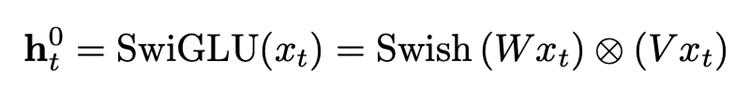 Time-MoE使用逐点分词方法以确保时间序列信息的完整性,提高了模型处理不同长度序列的灵活性与适用性,如模型框架图中①所示。在②中,SwiGLU激活函数对每个时间序列点进行嵌入,其中包括一个Feed-forward network (FFN) 和一个Swish FFN,从而增强模型对多维输入的处理能力: