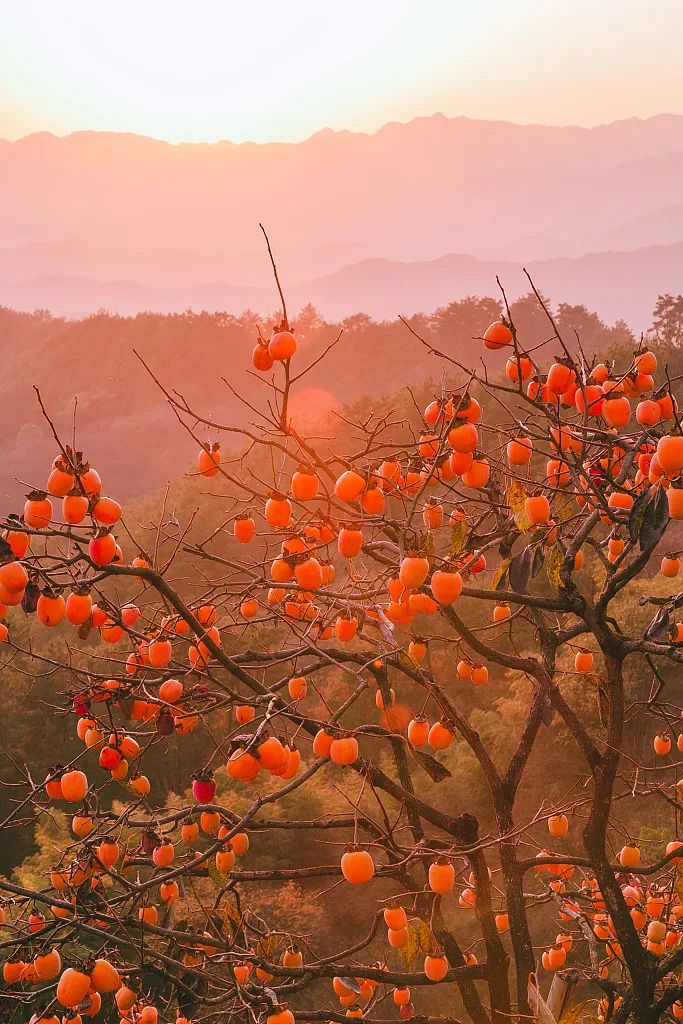 “白露打核桃,霜降摘柿子”。霜降正是柿子最适合采摘的时候。皮薄肉多的柿子味道滑嫩软甜,做成柿饼,更是鲜美可口。不仅如此,柿果外观光艳红润,这个时节缀满枝头,远远望去,像染红的晚霞,点燃了深秋。
