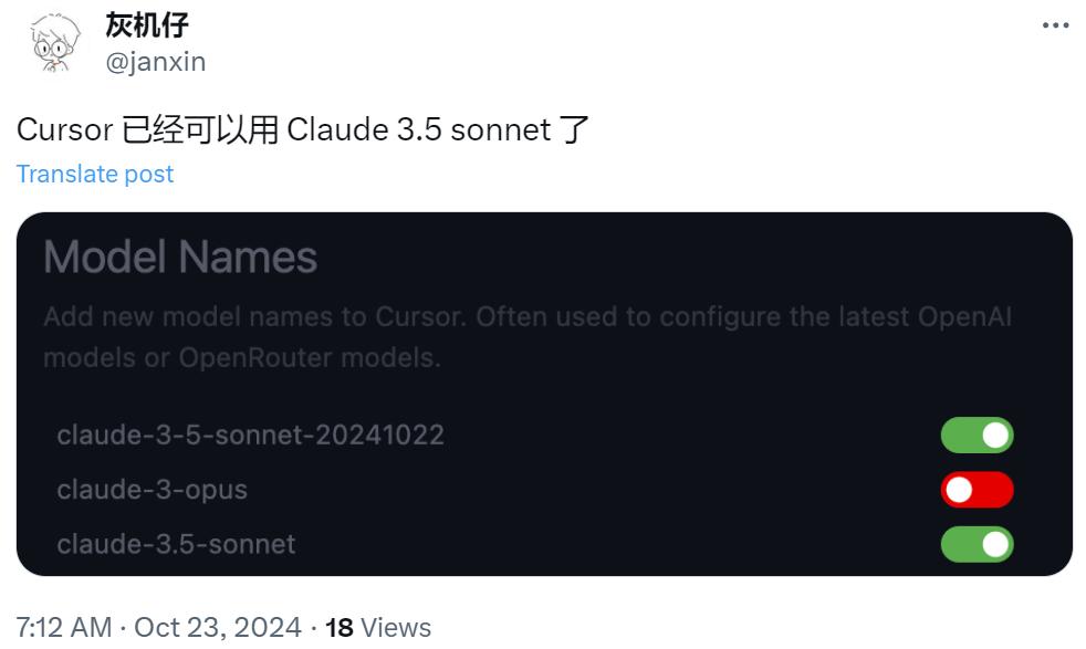 顺带一提,在 Anthropic 更新 Claude 3.5 的同时,热门 AI 编程工具 Cursor 也已经成功接入 Claude 系列模型。根据许多网友分享的截图,接入 Cursor 的 Claude 3.5 Sonnet 正是最新的 20241022 版本!