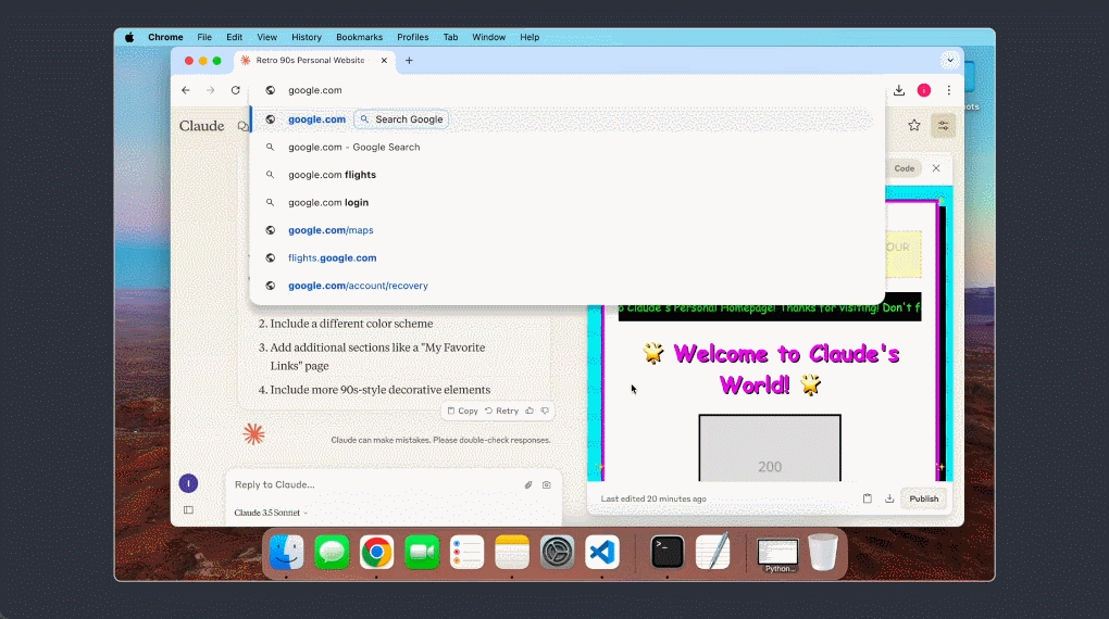 再结合 Claude 的其它能力,这种训练赋予了它非凡的能力,可以将用户的文本提示词转化为一系列逻辑步骤,然后在计算机上采取行动。开发团队观察到,如果遇阻,该模型甚至还能自我纠错并重试任务。